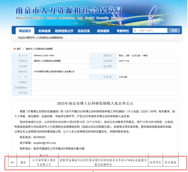 發(fā)布日期:2025-11-14 11:02 來源:省環(huán)境工程技術(shù)有限公司 字體:[ 大 中 小 ]近日,南京市人社局公布了2025年博士后科研資助名單,本年度共80位博士后獲得科研資助。其中,卓越項目10項,優(yōu)秀項目70項;21位為單位直薦,59為綜合遴選。工程技術(shù)公司博士后創(chuàng)新實踐基地崔巖博士后通過綜合遴選,入選南京市博士后優(yōu)秀項目資助。