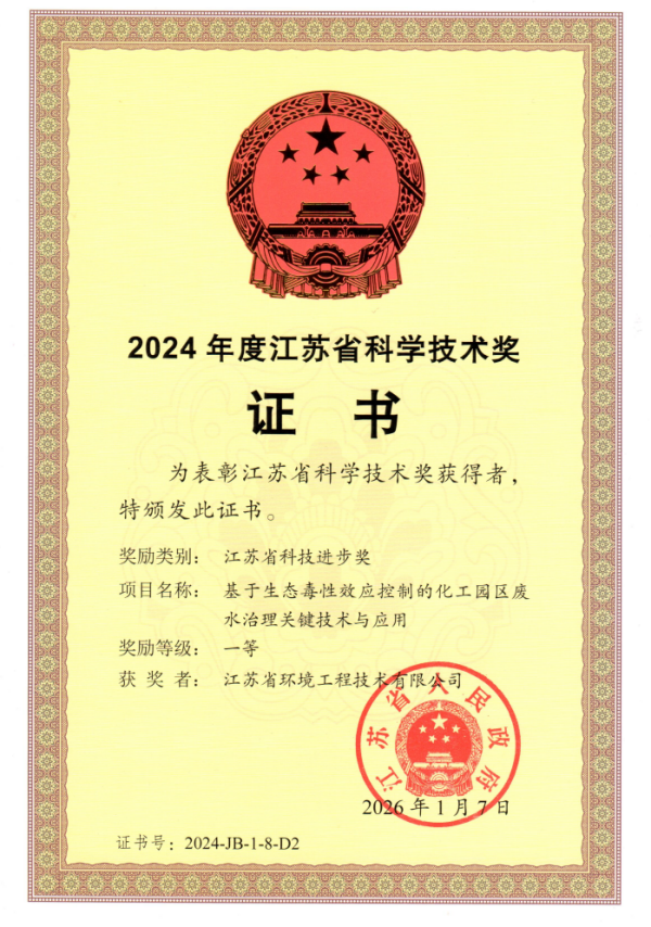 發(fā)布日期:2026-02-13 22:08 來源:省環(huán)境工程技術(shù)有限公司 字體:[ 大 中 小 ]近日,省環(huán)保集團(tuán)所屬省環(huán)境工程技術(shù)有限公司被授予江蘇省科學(xué)技術(shù)獎證書。研究成果“基于生態(tài)毒性效應(yīng)控制的化工園區(qū)廢水治理關(guān)鍵技術(shù)與應(yīng)用”榮獲江蘇省科技進(jìn)步獎一等獎。江蘇省科學(xué)技術(shù)獎是江蘇省科技領(lǐng)域的最高榮譽(yù)獎,旨在獎勵在全省科學(xué)技術(shù)活動中做出突出貢獻(xiàn)的成果,以此推動行業(yè)科技進(jìn)步。
